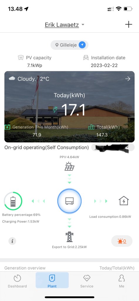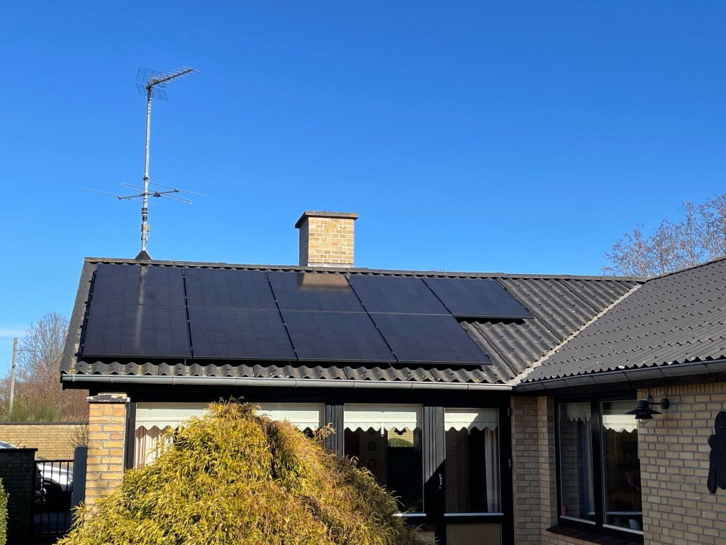 - Vores 7,1kWp solcelleanlæg har produceret cirka 6.700 kWh de seneste 12 måneder, og af disse har vi selv anvendt cirka 3.400 kWh, mens resten er solgt til Vindstød til spotpris.